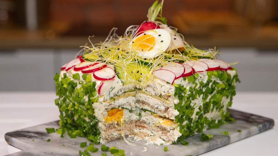 7. I gotowe! Wiosenny tort z kanapek można dzielić na mniejsze części 😉