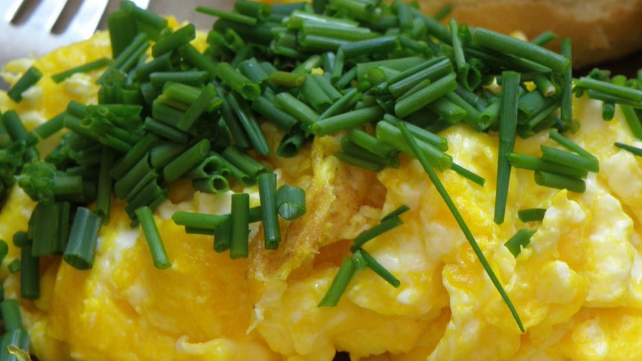 Gotową jajecznicę podaj z ulubionymi dodatkami. Smacznego!