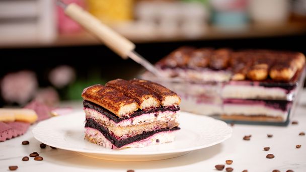 Zrób jagodowe tiramisu – letni deser z biszkoptami, kremem śmietankowo-mascarpone i owocową galaretką z jagód. Lekki, pyszny i zachwycający! Idealny na lato.