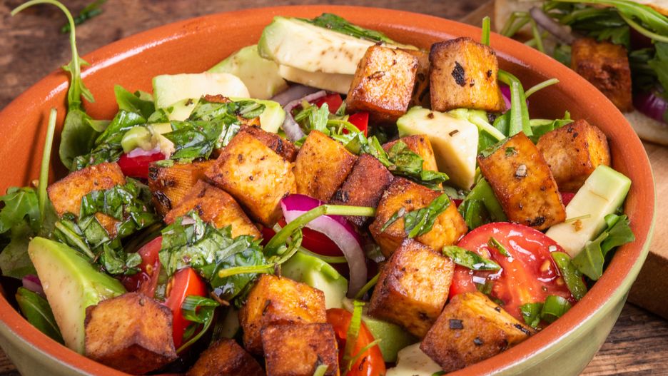 - Piekarnik nagrzej do 190 stopni. Tofu osusz ręcznikiem papierowym i pokrój w kostkę lub grubsze plastry.