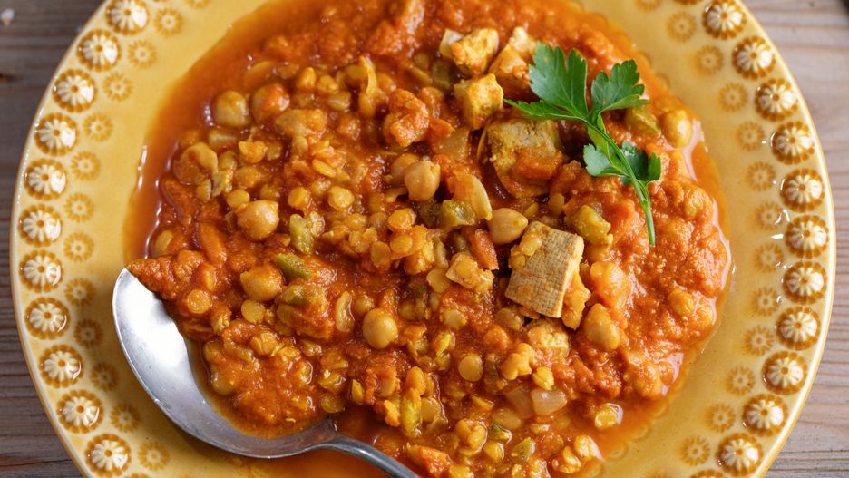 Ta zupa składa się z trzech głównych składników, które zalewamy pomidorami z puszki oraz bulionem: ciecierzycy konserwowej, soczewicy i wędzonego tofu. To dzięki nim jest tak sycąca, ponieważ są bogate w białko roślinne i błonnik, powoli trawią się w żołądku, zapewniając uczucie sytości na długo.