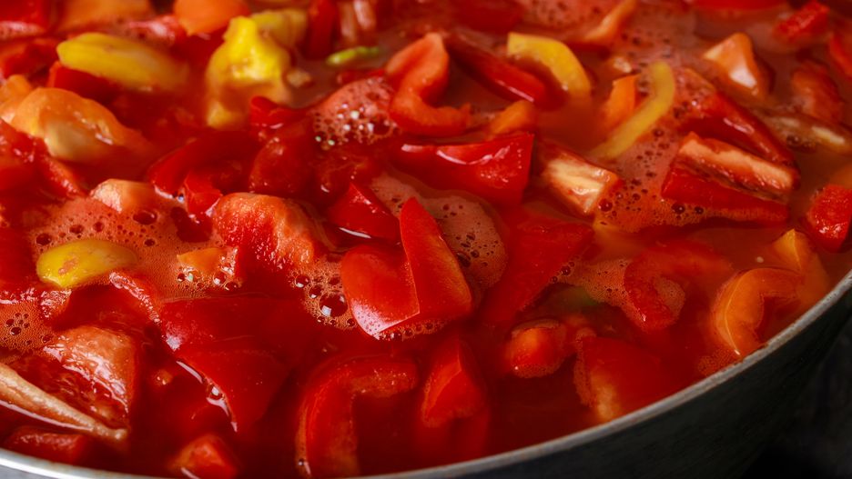 Już na etapie duszenia warzyw, warto wrzucić kilka składników, które podkręcą aromatyczność dania. Zaczynamy od podsmażenia cebuli, która dodaje gęstości, słodyczy i odrobiny pikanterii. Do cebuli dobrze jest dodać pokrojony w drobne plasterki czosnek. Smaż go tylko przez krótką chwilę – za bardzo przyrumieniony może zrobić się gorzki. Następnie wrzuć paprykę i podsmaż do zarumienienia. W osobnym garnku podgrzej pomidory z dodatkiem kilku ziarenek ziela angielskiego i liści laurowych. Możesz wrzucić także 3–4 suszone owoce jałowca.