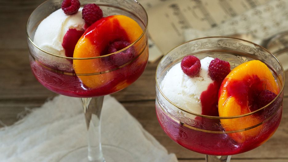 - W pucharkach ułóż porcje lodów waniliowych, polej je syropem z brzoskwiń, dodaj mus malinowy i bitą śmietanę.