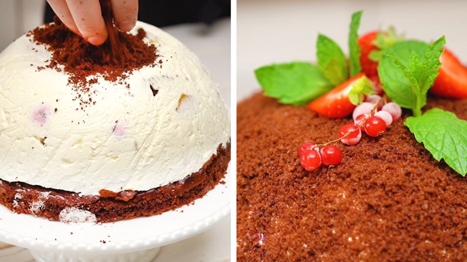 - Po tym czasie wyjmij delikatnie ciasto z miski, po czym usuń folię spożywczą. Powstałą w ten sposób kopułę posyp obficie pokruszonym wcześniej biszkoptem. Smacznego!