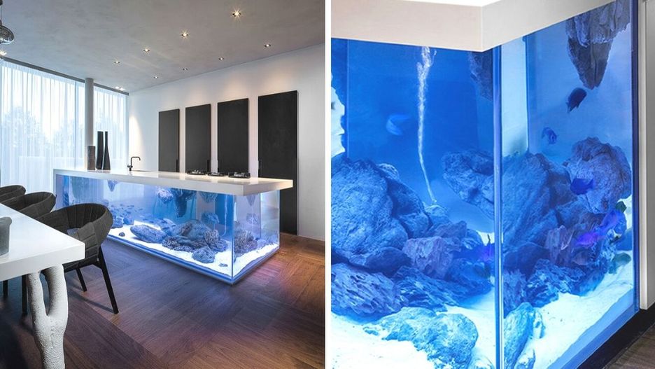 Kuchnia "Ocean" to wyjątkowe akwarium pod blatem kuchennym, które można bez wysiłku unosić za naciśnięciem jednego przycisku. Wyspa ma właściwie kształt dużego „L” - schowek wewnątrz lady jest ukryty za pomocą luster, dzięki czemu akwarium wydaje się większe niż jest.