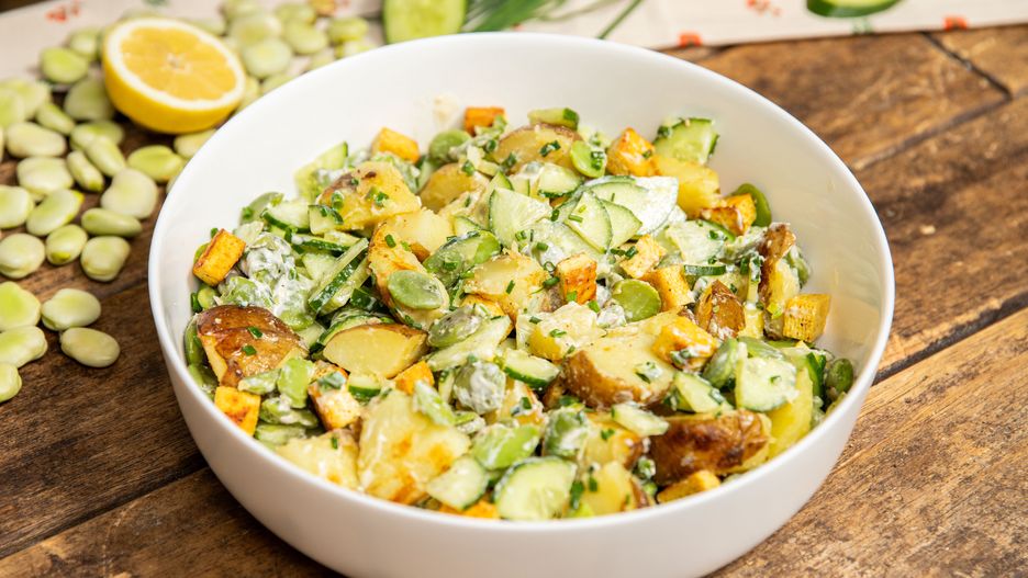 Ta sałatka to kwintesencja letnich posiłków. Nic bardziej nie kojarzy się z ciepłym miesiącami jak gotowany bób i młode ziemniaczaki. Świeżości dodaje dodatkowo zielony ogórek, a dodatek tofu sprawia, że sałatka jest bardziej sycąca.
