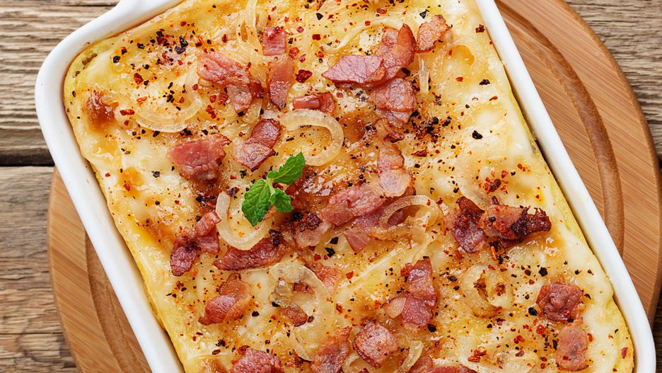 - Ziemniaczaną masę przełóż do formy i posyp pozostałym boczkiem z cebulą.