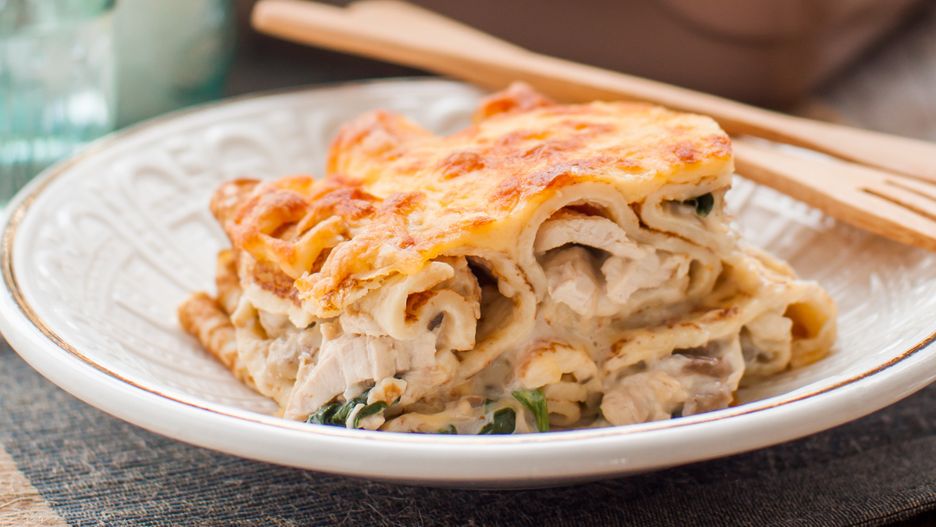 Do zapiekanki naleśnikowej sprawdzą się zarówno klasyczne pszenne naleśniki, jak i naleśniki gryczane. Takie są szczególnie popularne w kuchni francuskiej. Galettes bretonnes podawane są z różnymi farszami, najczęściej z jajkiem i szynką, ale także ze szpinakiem lub suszonymi pomidorami. W poniższym przepisie znajdziesz nie mniej smakowity zestaw. Miękkie placuszki przekładam kremowym farszem z kurczakiem, szpinakiem i pieczarkami.
