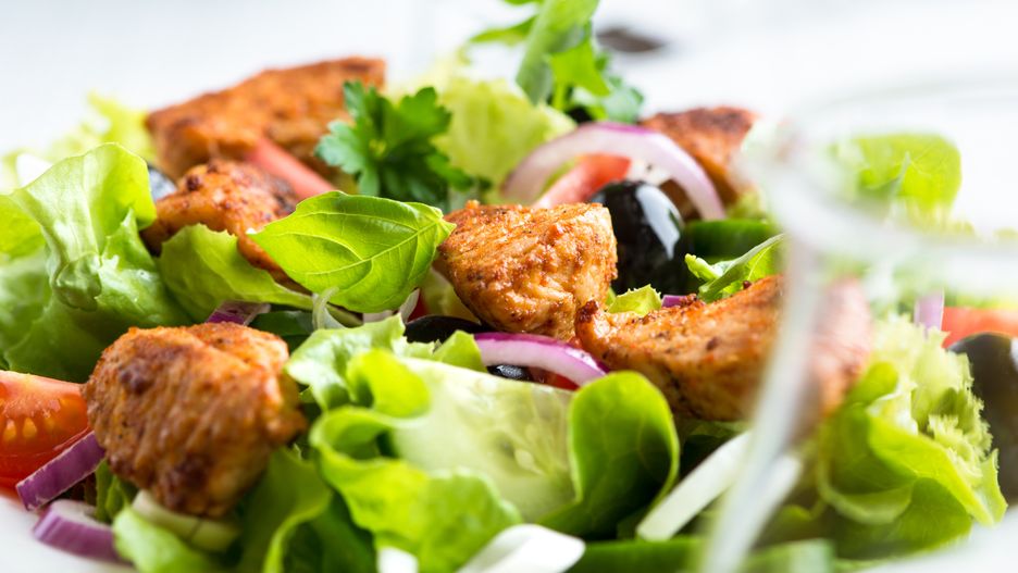 - Sałatę rwę na listki. Dodaję pokrojoną pieczoną paprykę, pomidorki, oliwki, posiekaną cebulę i kurczaka. Posypuję szczypiorkiem.