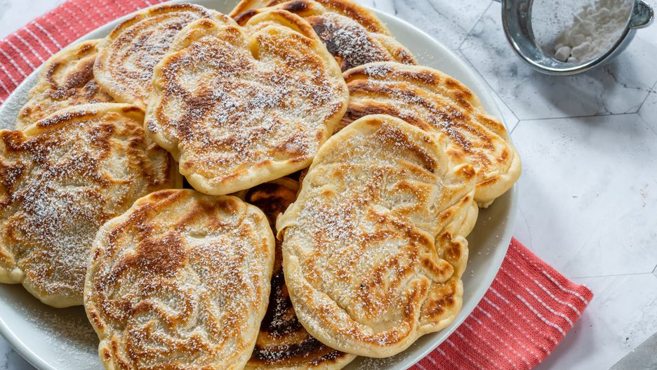 - Smażenie: Rozgrzej na patelni masło z olejem. Na patelnię połóż kilka plastrów jabłka, a następnie nakładaj porcje ciasta. Smaż z obu stron na złoty kolor.