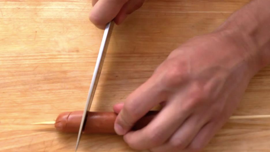 Nabił parówkę na długą wykałaczkę i zaczął ją odpowiednio ciąć. Na końcu powstało coś smakowitego!