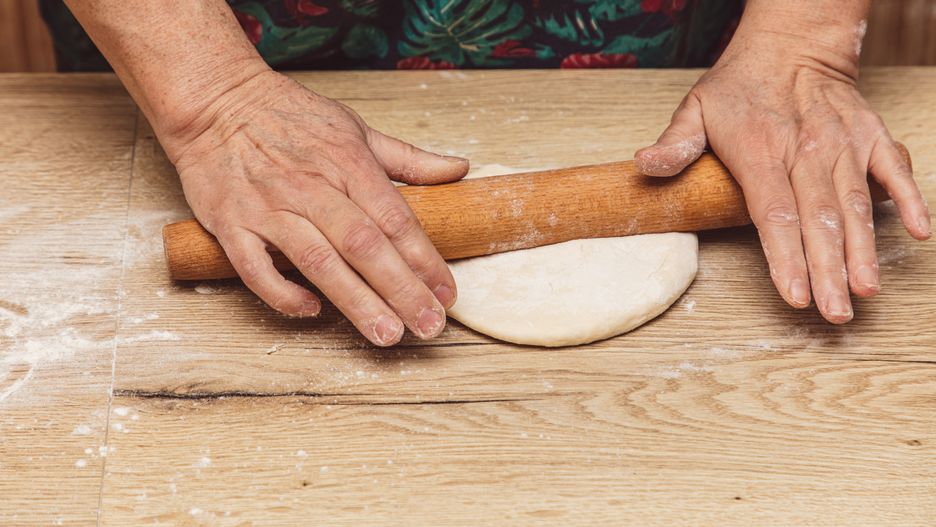 - Kiedy już uzyskasz formę ciasta, rozwałkuj je na cienki placek.