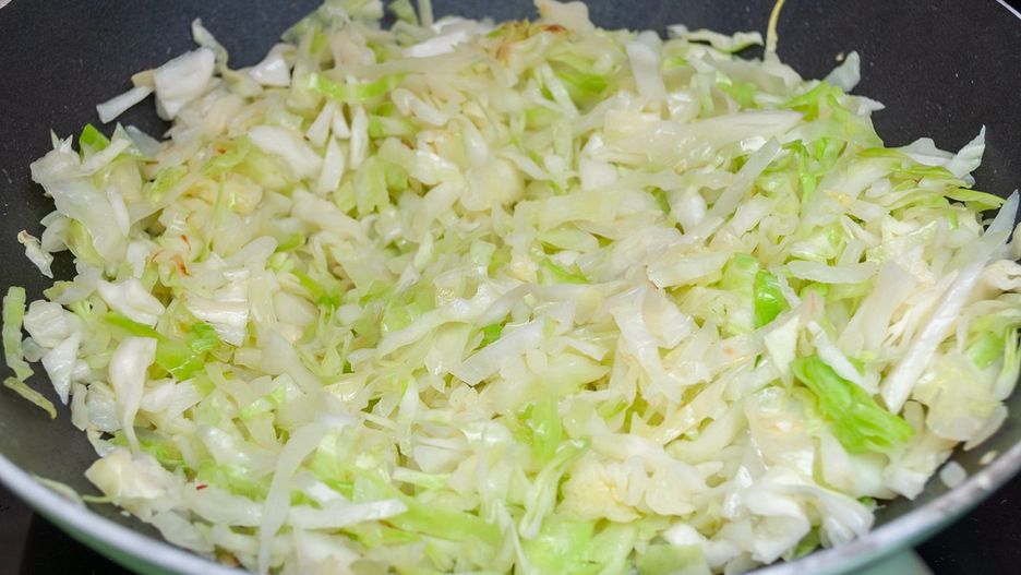 - Dodaj kapustę i smaż, mieszając od czasu do czasu, aż się zarumieni.
