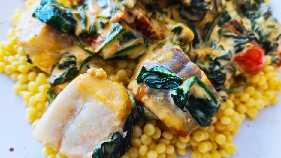 Ten obiad przygotujesz w zaledwie 15-20 minut, co czyni go królem szybkich posiłków po pracy. Delikatność ryby i kremowość sosu potrzebują odpowiedniego tła. Najlepiej wypada tu kuskus perłowy. Jego większe ziarna doskonale chłoną sos, nie tracąc przy tym swojej sprężystości. Dodatek suszonych pomidorów wprowadza potrzebną nutę umami, a pomidorki koktajlowe dodają świeżości i koloru.