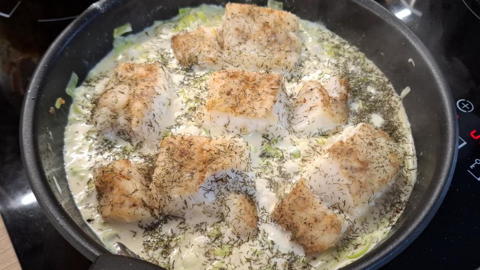 - Dodaj do sosu obsmażonego dorsza, duś 3-4 minuty, posyp koperkiem. Podawaj ziemniaczanym purée lub ryżem i ulubioną surówką.