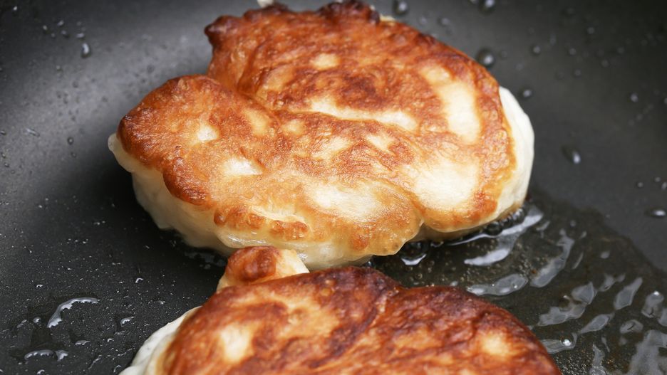 - Rozgrzewam olej na patelni, nakładam porcje ciasta łyżką i smażę na złoty kolor z obu stron.