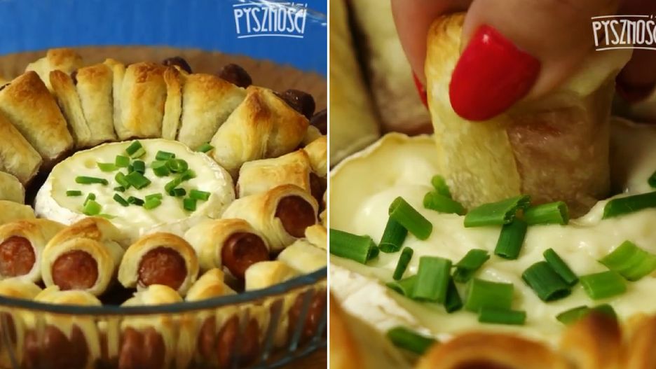 Poniżej zobaczysz przepis na przyrządzenie zapiekanych kiełbasek w cieście z rozpływającym się serem camembert.