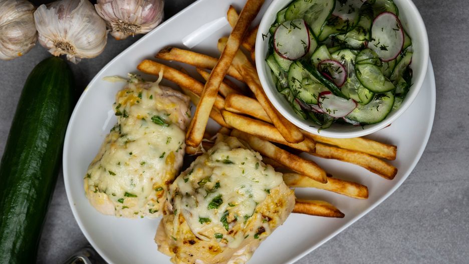 Przepis na obiad. Pieczony kurczak z surówką i frytkami - wideo