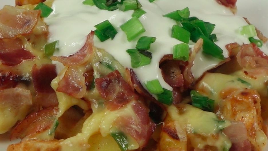 Pyszna zapiekanka z ziemniakami, kurczakiem, serem, boczkiem i zieloną cebulką