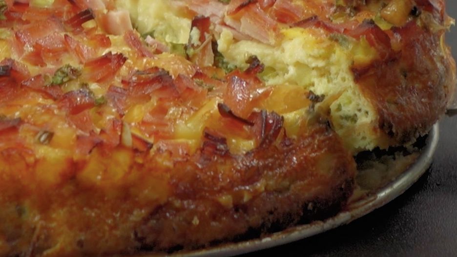 Zapiekanka z ziemniakami, brokułami, serem i szynką