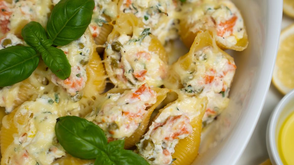 Conchiglioni, czyli duże muszle (zapiekanka makaronowa z ricottą i łososiem), to jeden z naszych ulubionych rodzajów makaronu. Możesz go przygotować klasycznie, gotując i podając z sosem lub zapiec w pysznej formie zapiekanki. Nasz makaron wypełniliśmy po brzegi kremowym farszem z ricotty, groszku i łososia.