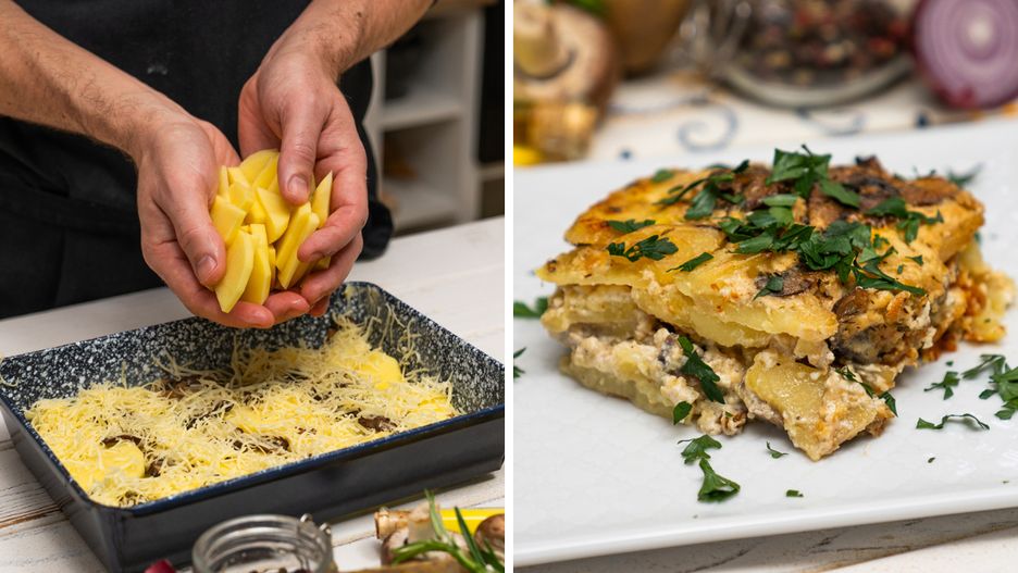 Zapiekanka na bazie ziemniaków i pieczarek to sprawdzony pomysł na rodzinny obiad