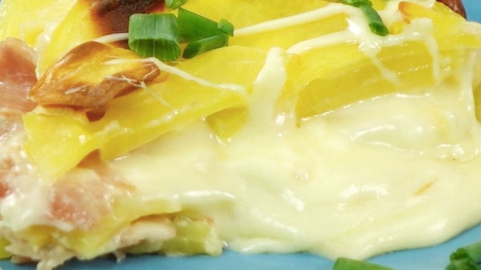 Poniżej zobaczysz przepis na przyrządzenie zapiekanki serowo-ziemniaczanej z szynką parmeńską.