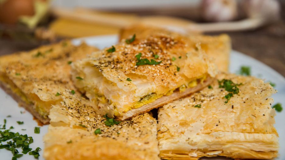 Zapiekanka z ciasta francuskiego z jajecznicą. Niezawodny pomysł na śniadanie i kolację