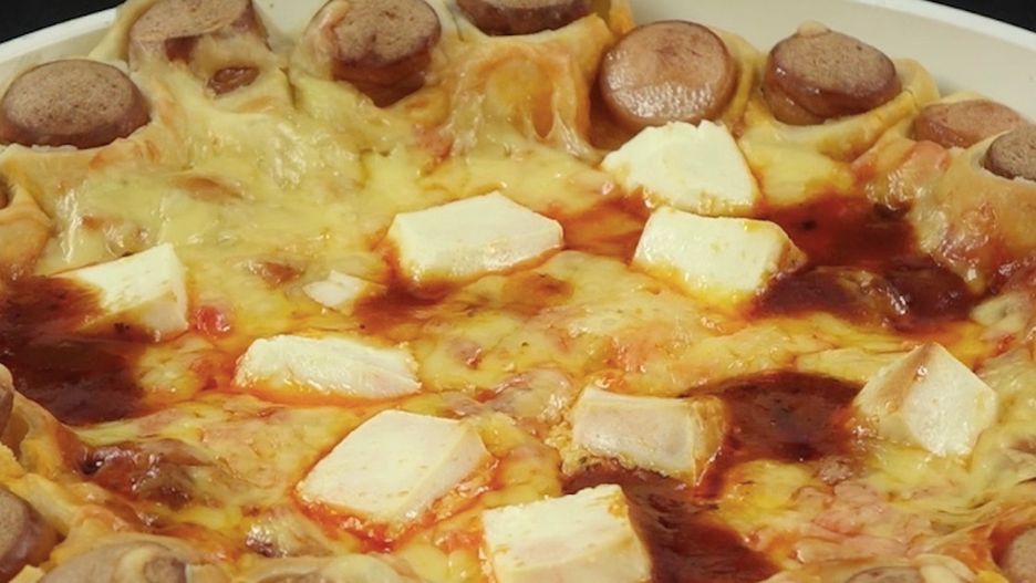 4. Poukładaj kawałki parówek w cieście wokół krawędzi okrągłego naczynia żaroodpornego. Na środku równomiernie rozłóż przygotowany wcześniej sos.