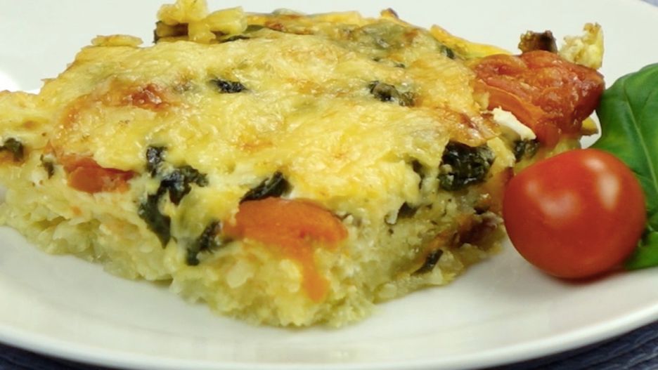 Poniżej zobaczysz przepis na przyrządzenie zapiekanki ziemniaczanej ze szpinakiem, serem i pomidorami.