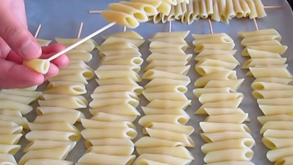 Teraz przygotuj blaszkę i wyłóż ją papierem do pieczenia. Makaron nadziewaj na wykałaczki do szaszłyków. Na tę ilość makaronu powinno ci starczyć 8-9 wykałaczek. Zostaw trochę wolnego miejsca na końcach.