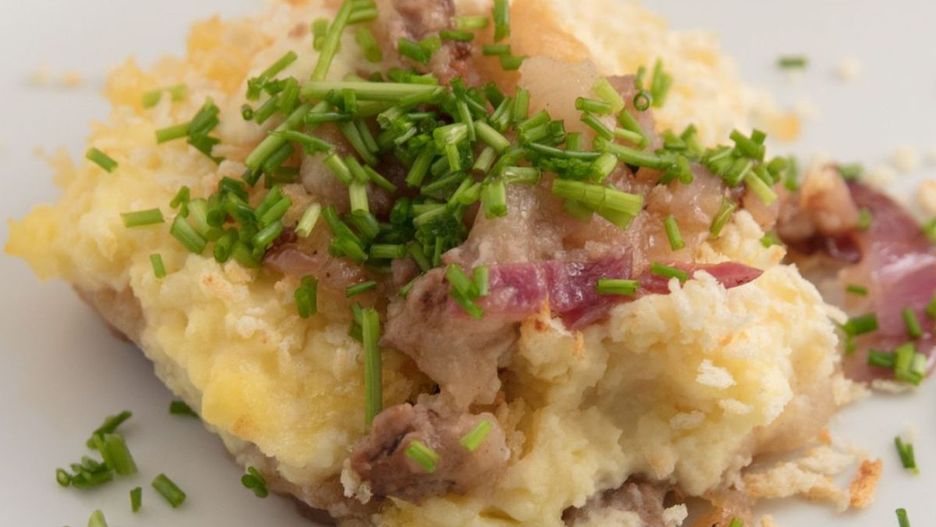 - Pozostałą wodę z garnka odlej, a ziemniaki z mąką ubij na purée. Słoninę lub boczek pokrój w niewielką kostkę i wytop na patelni do uzyskania skwarków.