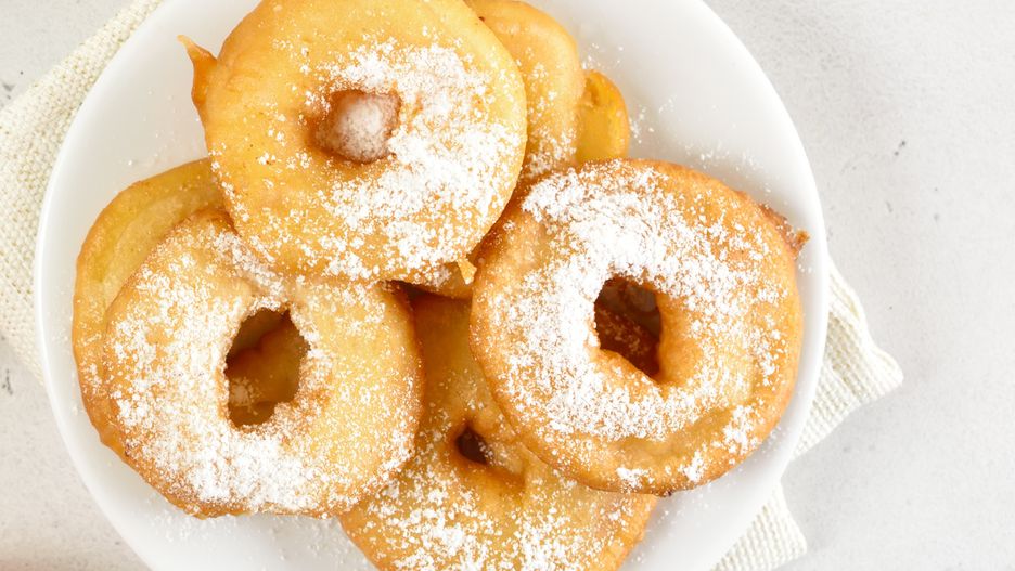 - Każdy krążek jabłka zanurz w gęstym cieście i smaż z obu stron na złoty kolor.