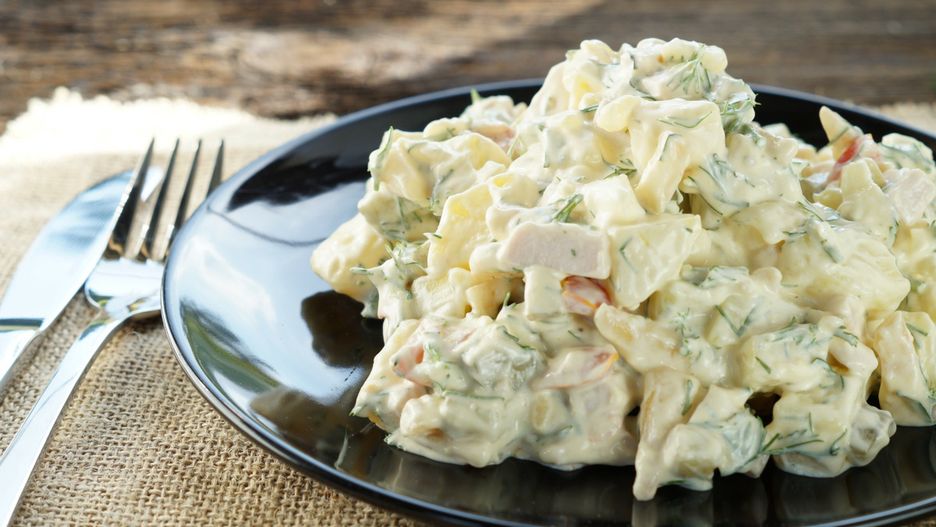 Podobną sałatkę przygotujesz z wędzonego pstrąga – wystarczy, że zamienisz majonez i musztardę na jogurt grecki. Zamiast natki pietruszki, dodaj szczypiorek lub koperek. Gotowe ziemniaki możesz zamienić na pieczone.
