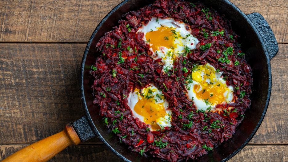 Szakszuka to idealne śniadanie na sezon jesienno-zimowy. Podawana prosto z patelni przyjemnie rozgrzewa, a bogactwo składników zapewnia solidną dostawę witamin i minerałów. Tradycyjna szakszuka przygotowywana jest z pomidorami i papryką, ale czemu by nie zrobić jej inaczej? Na przykład z gotowanymi lub pieczonymi burakami? Wymieszane z płynnym żółtkiem tworzą zaskakująco smaczne połączenie.