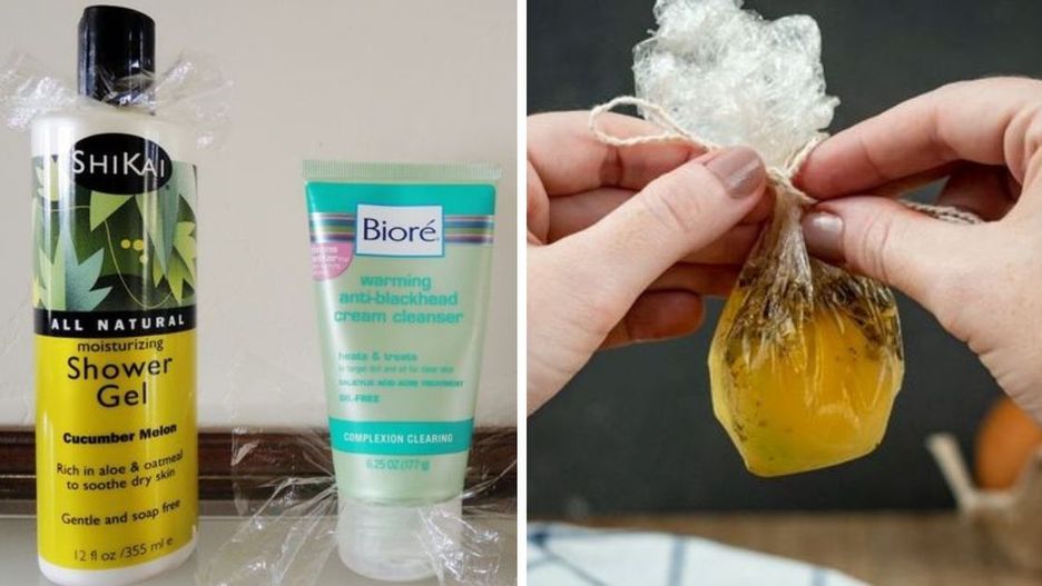 Rozlany szampon w kosmetyczce to nic miłego. Żeby uniknąć takiej przykrej niespodzianki- zabezpiecz swoje butelki folią spożywczą.