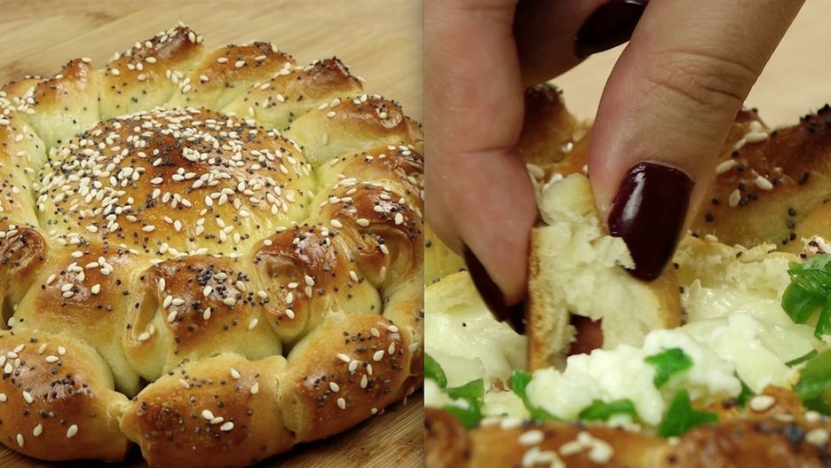 6. Po 30 minutach wyjmij zawijańca z piekarnika i odkrój część ciasta, pod którą znajduje się ser camembert. Oderwij boczny kawałek i namocz w roztopionym serze.