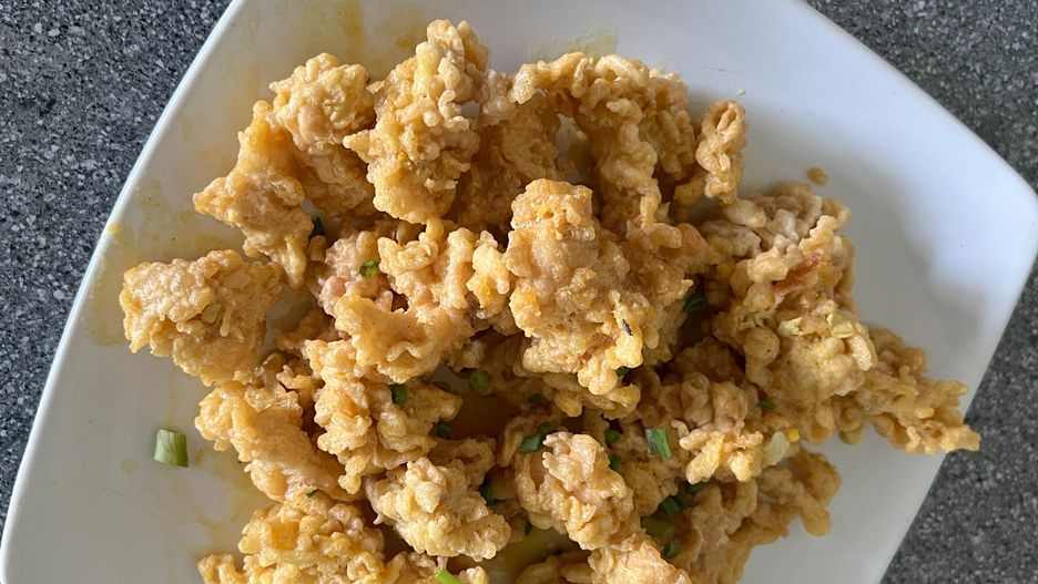 - Na patelni rozgrzej porcję oleju i smaż kawałki mięsa, aż będą złociste i chrupiące.