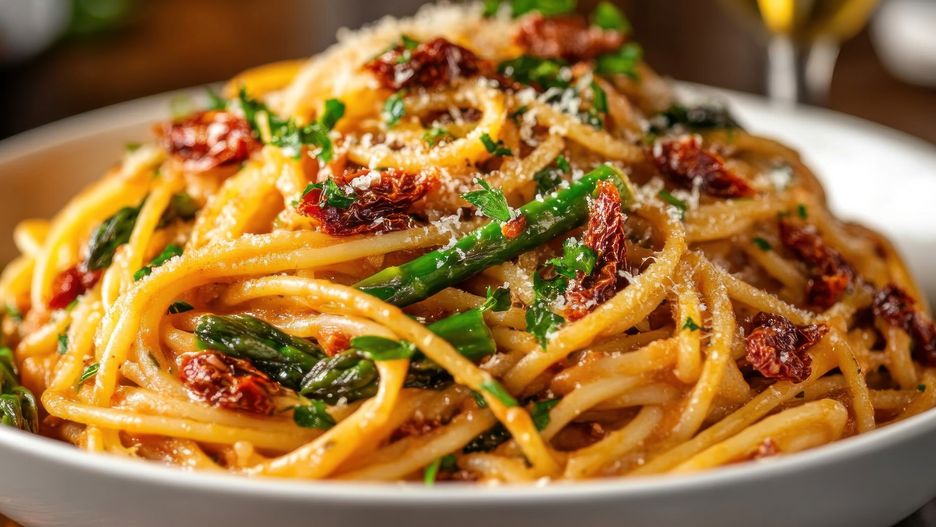 Wśród wielu pyszności, które można przygotować ze szparagów, na podium znajduje się właśnie ten makaron. Przygotowany na bazie śmietany, z dodatkiem suszonych i świeżych pomidorów oraz (rzecz jasna) szparagów, które nie są gotowane, a jedynie krojone i wrzucane na patelnię, dzięki czemu wychodzą chrupkie i świetnie komponują się z sosem. Jeśli lubisz pikantne smaki, możesz śmiało dodać odrobinę płatków chili, ale uważaj, bo niestety łatwo z nimi przesadzić.