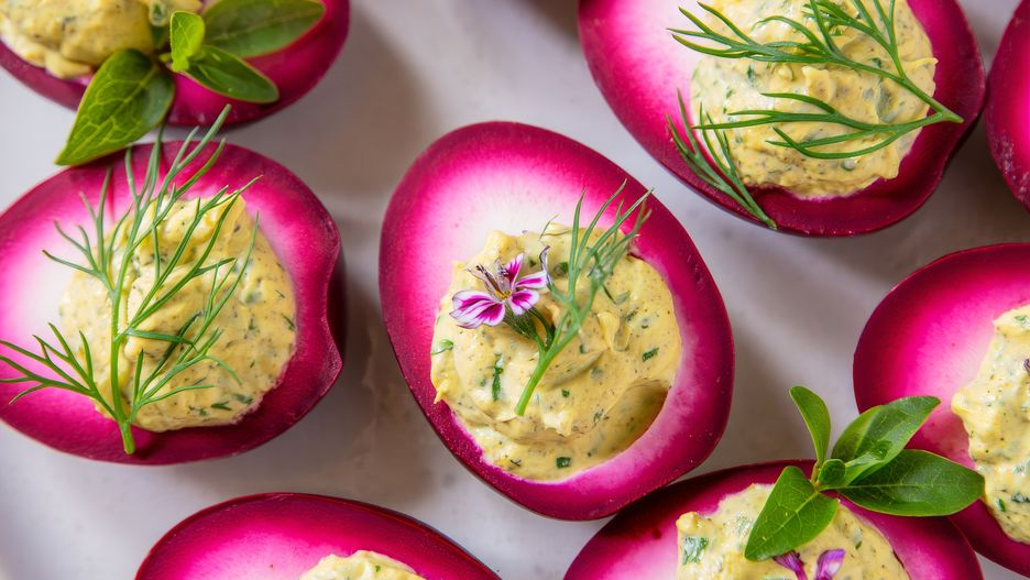 Barwienie jajek za pomocą warzyw nie jest niczym nowym, a jednak często o tym zapominamy. Po przygotowaniu marynaty na bazie startego buraka zanurzamy w niej ugotowane i obrane jajka na co najmniej dobę.