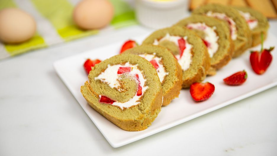 Zielona rolada biszkoptowa z matchą i truskawkami