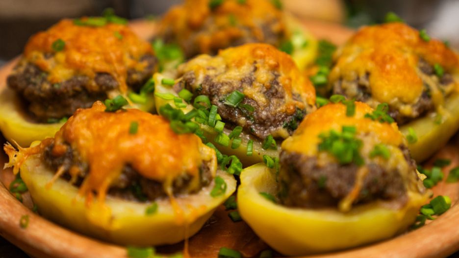 Ziemniaczane łódeczki wypełnione po brzegi mięsno-serowym farszem. Na jednej porcji na pewno się nie skończy