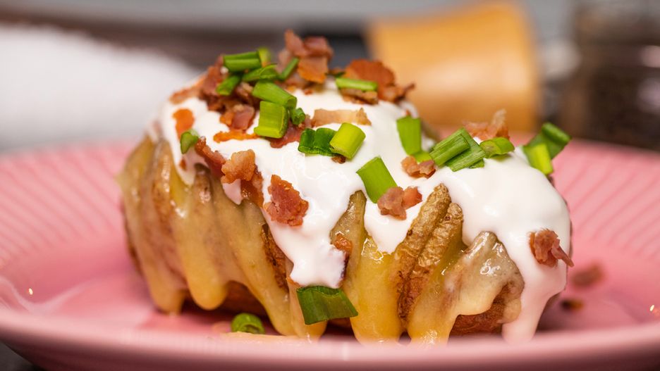 Pieczone ziemniaczki hasselback z boczkiem, śmietaną oraz szczypiorkiem - i nie potrzebujesz nic więcej, aby przygotować prawdziwą ucztę. Palce lizać!