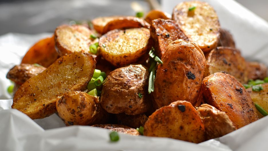 - Wyjmij ziemniaki, gdy będą rumiane i chrupiące.