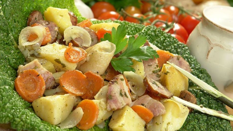 - W garnku umieść kolejno: plastry boczku, ćwiartki ziemniaków, marchewkę. Dopraw całość.