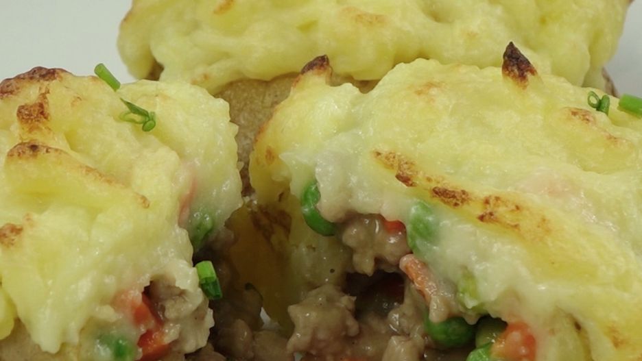 Pieczone ziemniaki nadziewane pysznym farszem z mięsem mielonym, marchewką i groszkiem