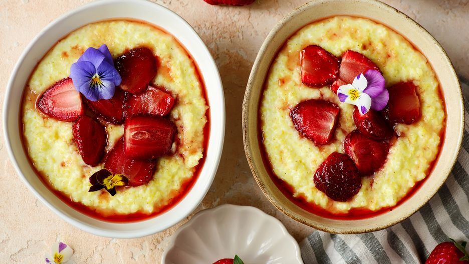 Przepis na jaglankę ze skyrem i pieczonymi truskawkami