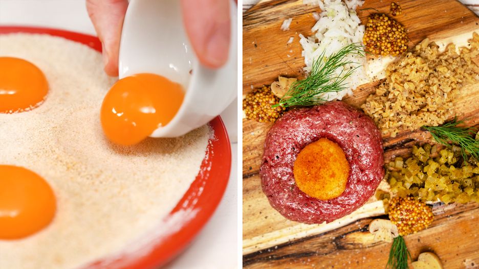 Krok 4: Usmażone żółtko serwuję na ulubionej przystawce. Ja najchętniej sięgam po klasyk, czyli tatar. Po przekrojeniu chrupiącej panierki żółtko apetycznie rozpływa się na talerzu. Prosty i efektowny dodatek sprawdzi się również na kanapkach np. z kremowym serkiem i wędzonym łososiem lub w sałatkach. Smacznego!