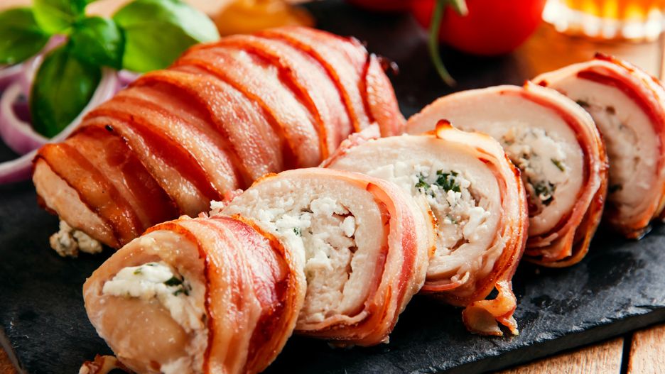 - Na rozbitych piersiach rozprowadź farsz, zawiń je w roladki, a następnie, owiń je w boczku.