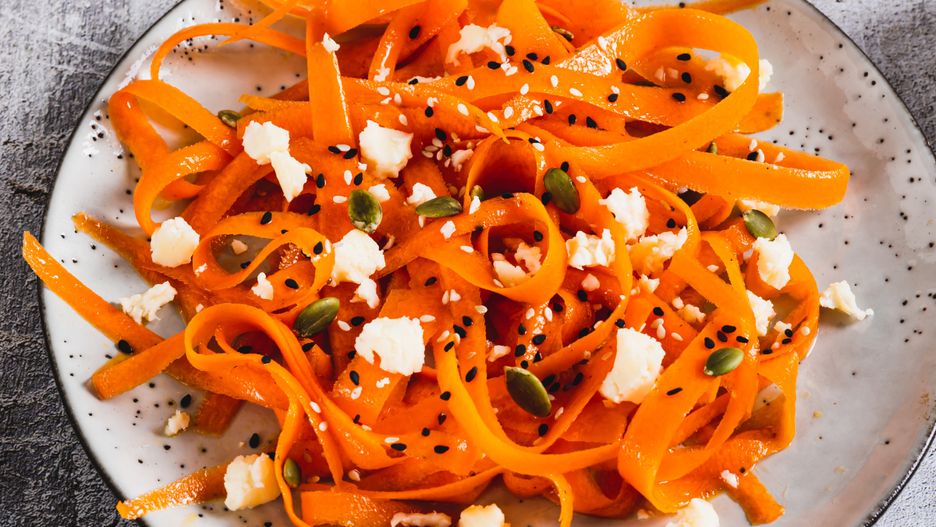 To prosta przekąska, która świetnie sprawdzi się na lunch lub kolację. Marchewka najlepiej prezentuje się w formie długich wstążek, przypominających nieco tagliatelle.